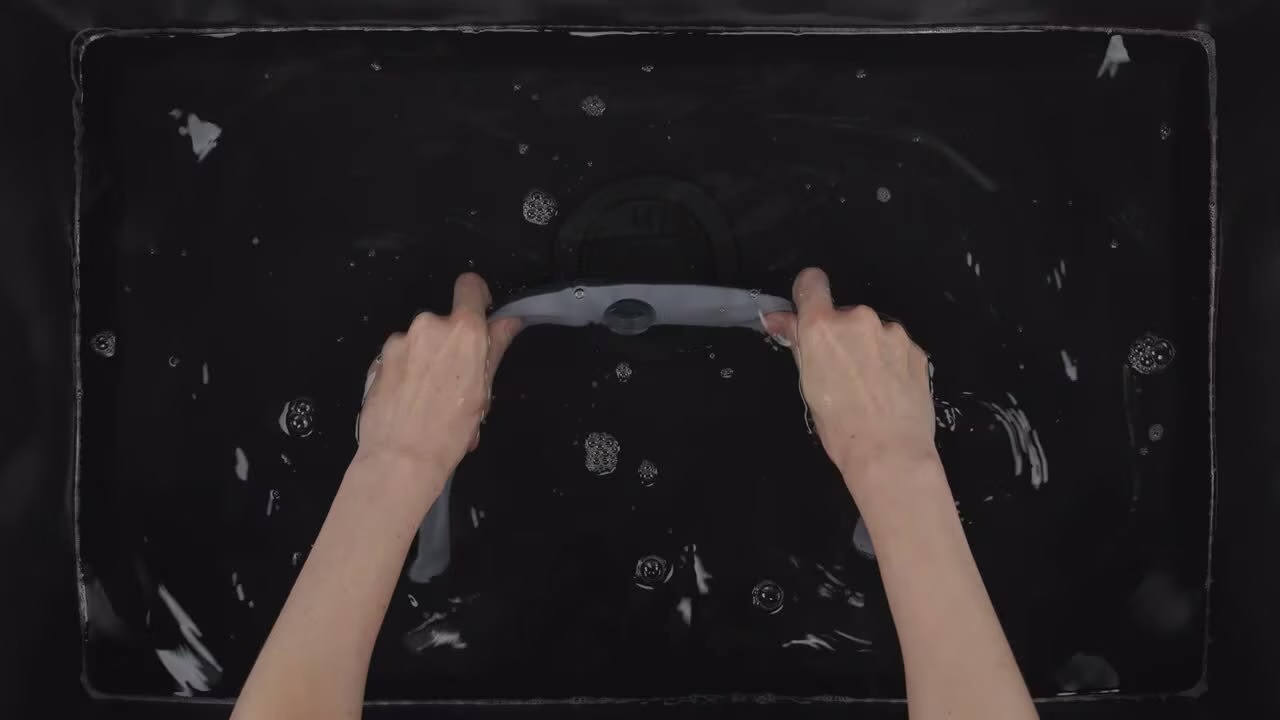 - Dokładnie spłukać elementy pod bieżącą wodą. Jeżeli tuleja na ramce ulegnie skręceniu, można skorygować jej położenie, gdy jest mokra.