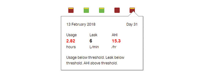 Umożliwia podgląd czasu użytkowania, AHI i przecieków z ostatnich 10 dni. Przewodnik po ikonach AirView jest dostępny tutaj