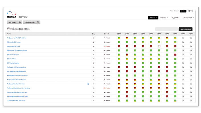 Pulpit nawigacyjny AirView z kodowaniem kolorami umożliwia łatwą identyfikację przypadków o niskim czasie użytkowania i rezydualnego wskaźniku AHI.